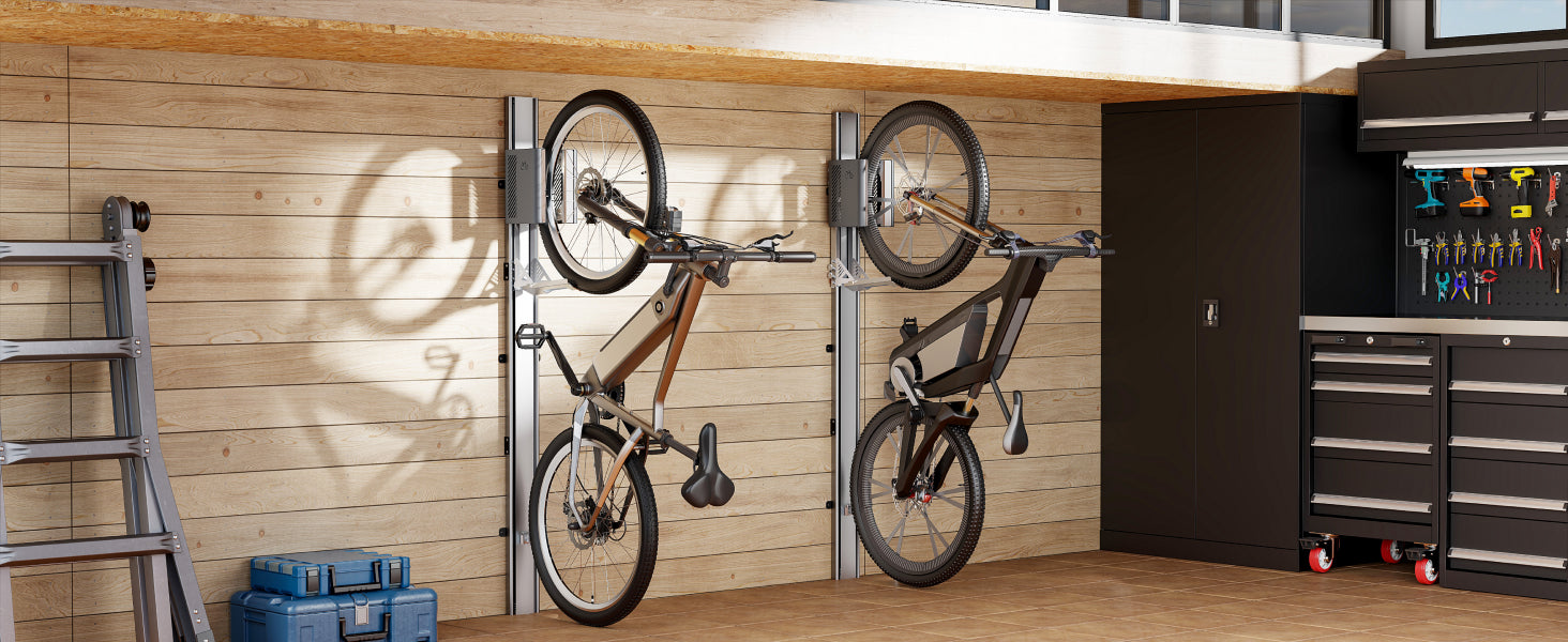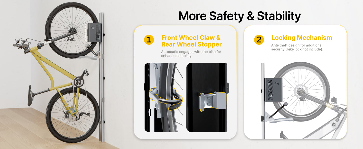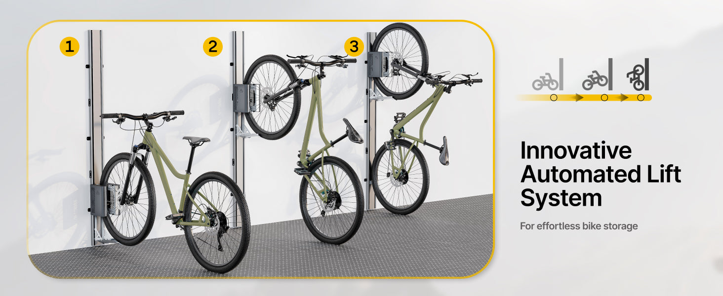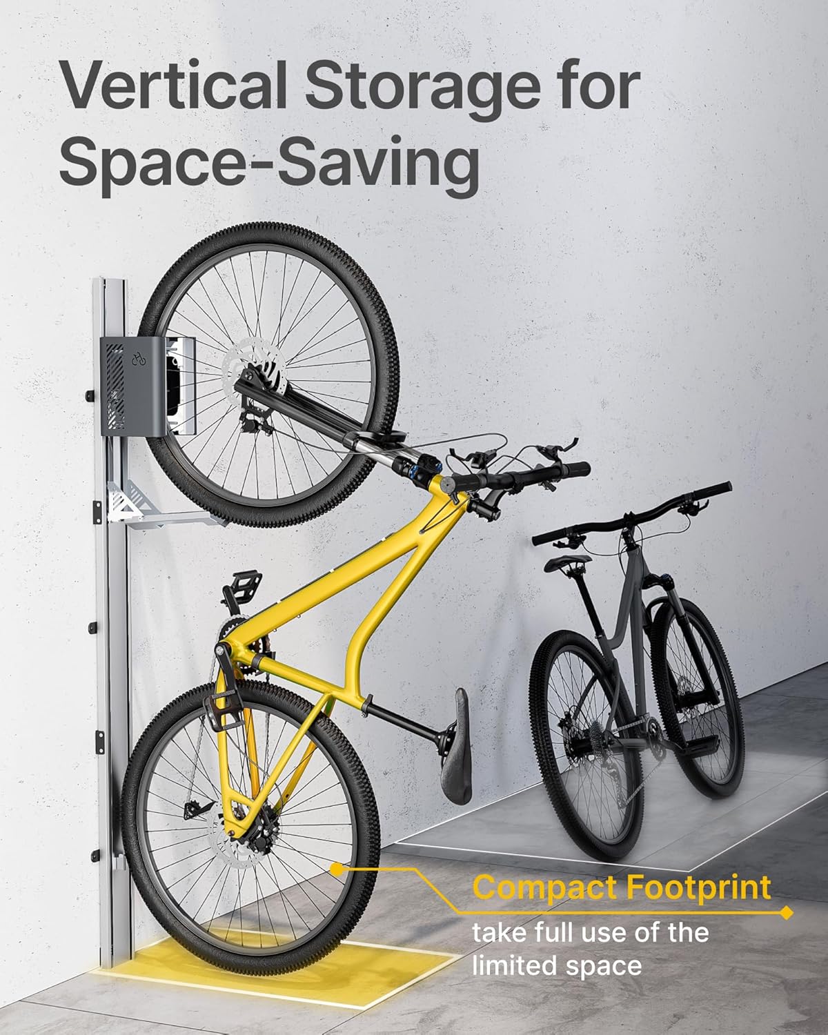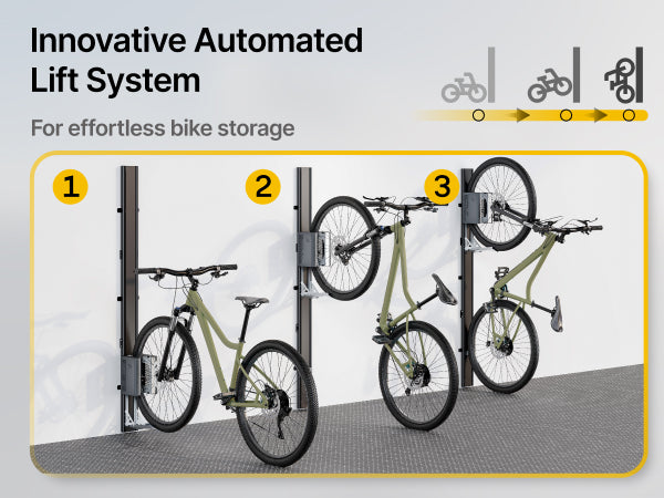 • EFFORTLESS AUTOMATIC LIFT: Featuring an automatic mechanical lift system, this automatic bike hoist effortlessly raises and stores your bike with minimal effort. Just place your bike on the system, and it gradually lifts to a vertical position, ensuring an easy and smooth storage experience for all users