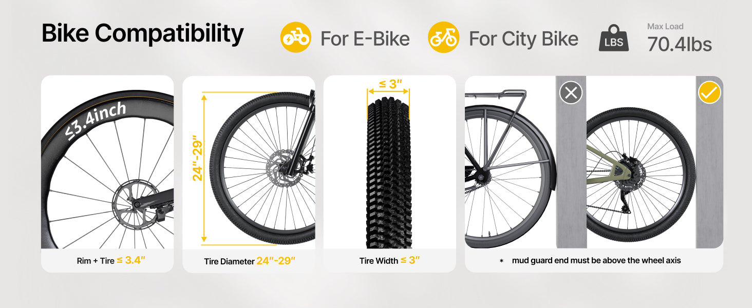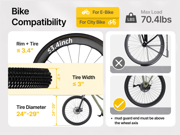 • HEAVY-DUTY & VERSATILE COMPATIBILITY: Made from durable anodized aluminum and stainless steel, this wall-mounted vertical bike lift supports 24-29" bikes with tires up to 86mm in height and 3" in width, holding up to 71lbs. Its sturdy design is ideal for road, mountain, and e-bikes, providing reliable, long-lasting storage