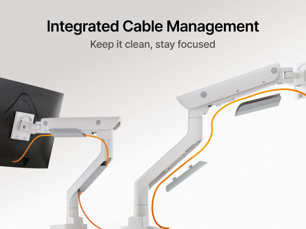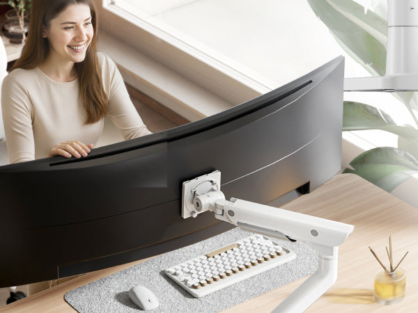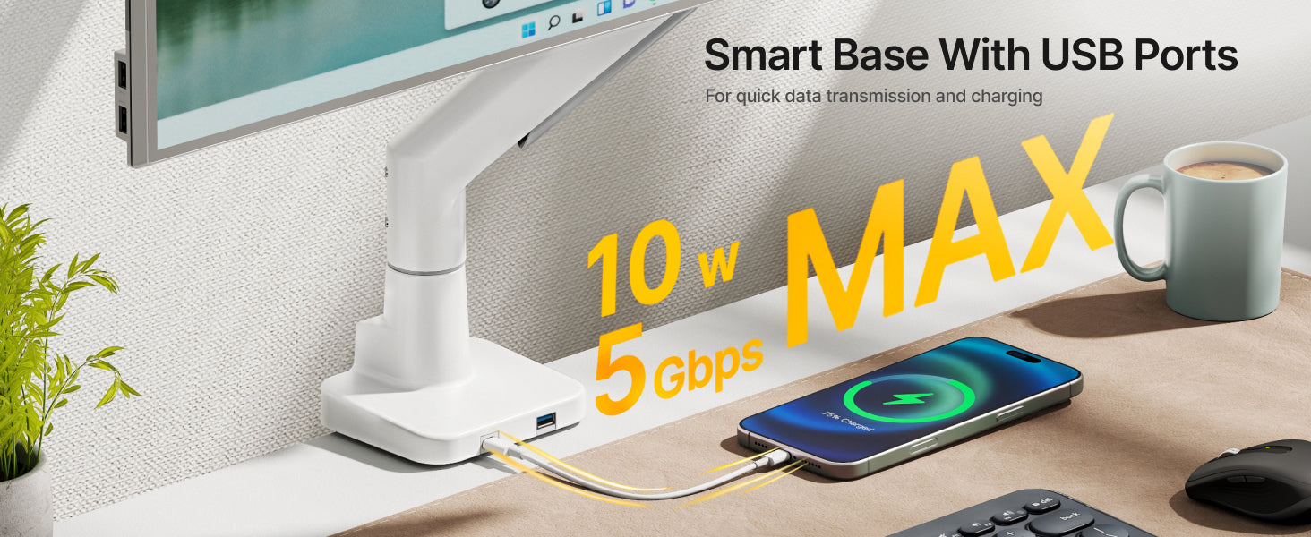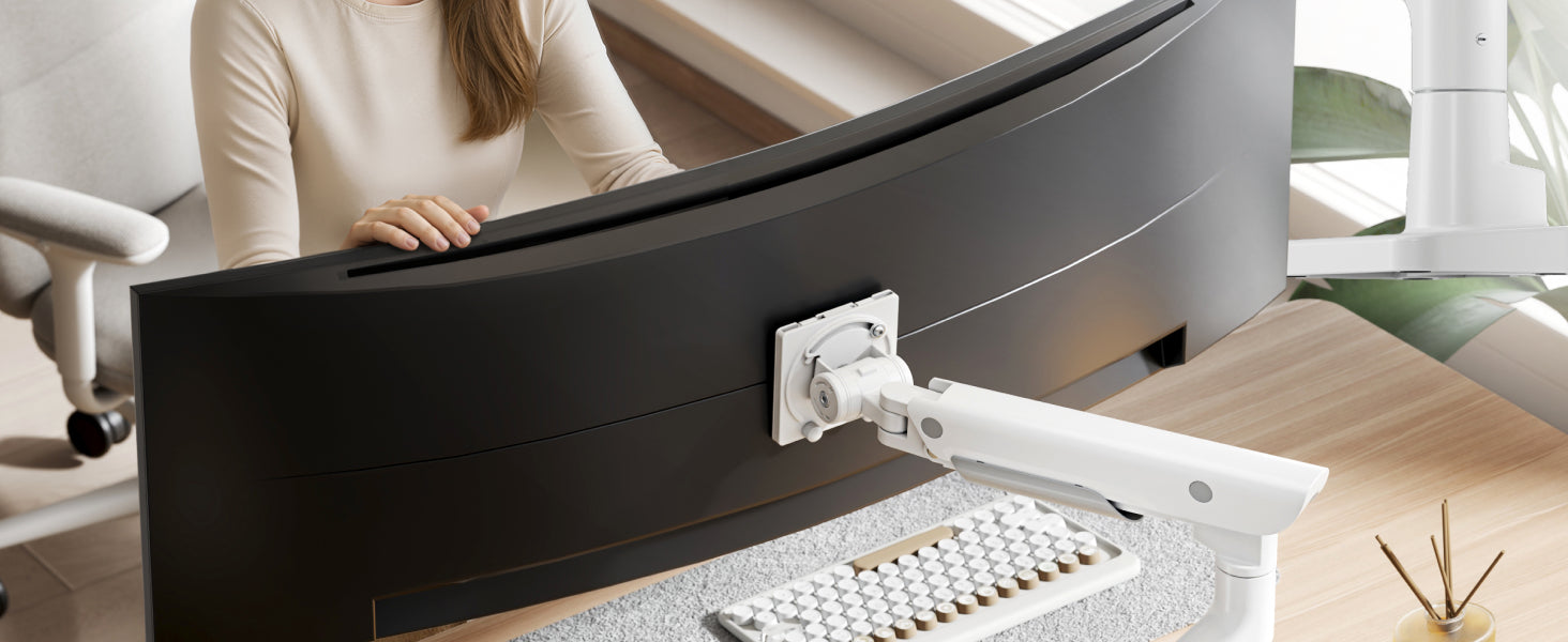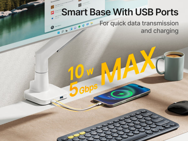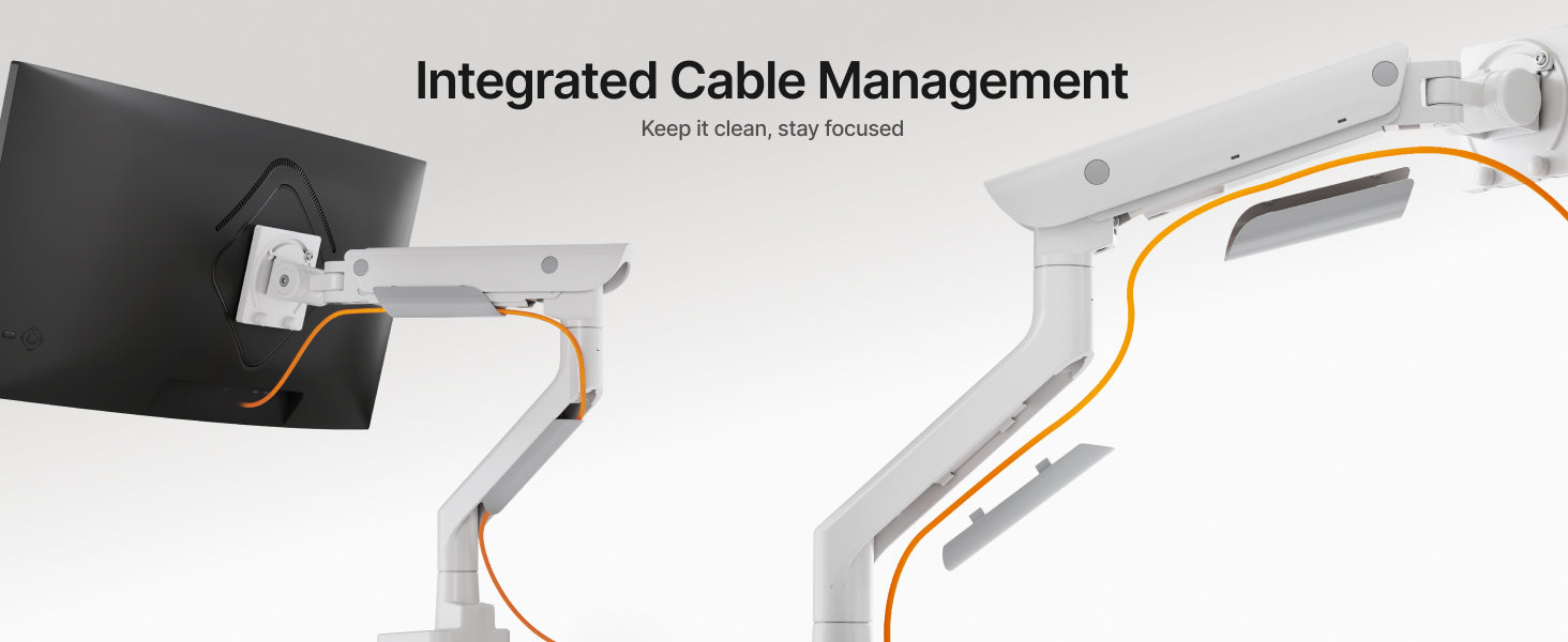 • 【Space-Saving Design】Designed for both convenience and organization, this ultrawide monitor arm features built-in USB-A 3.0 and USB-C ports for easy device charging and fast data transfer. The integrated cable management routes wires neatly along the arm, eliminating clutter and freeing up valuable desk space. Whether you're working or gaming, enjoy a cleaner desk space