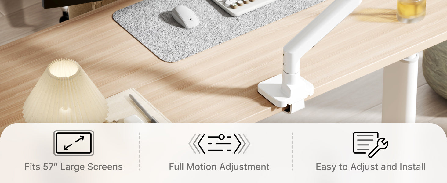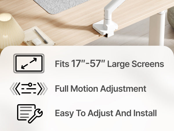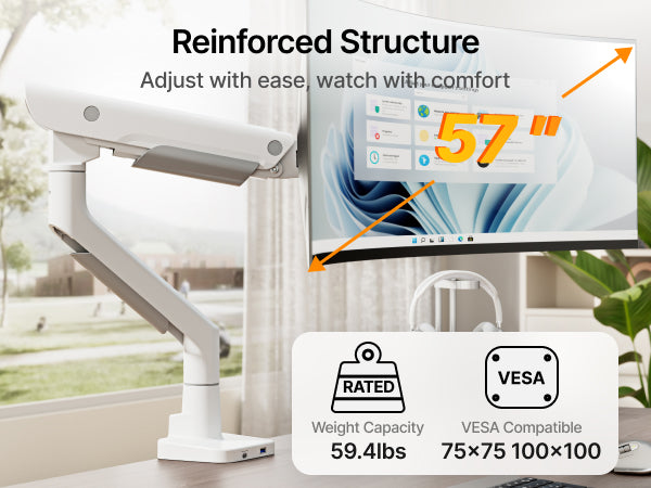 • 【Supports up to 57 Inch and 59.4 lbs】This heavy duty monitor arm securely holds ultrawide monitor weighing up to 59.4 lbs, and is compatible with most flat and curved screens for 17 to 57 inch. It comes with 75x75 or 100x100 VESA mount holes. Perfect for Samsung Odyssey G9, LG and most 57 inch curved monitor available on the market. Please ensure your monitor has compatible VESA mount holes—if not, you will need to prepare your own VESA mount adapter (not included)