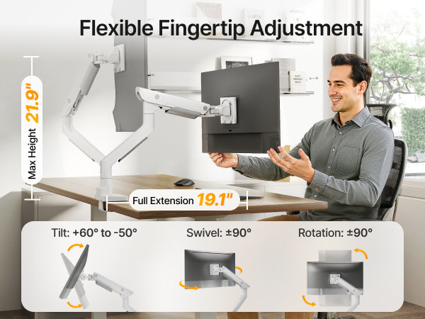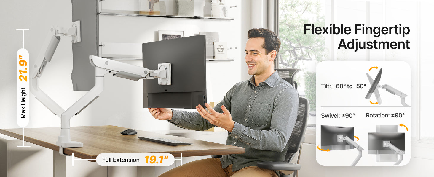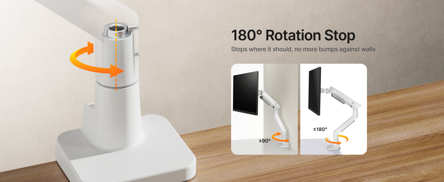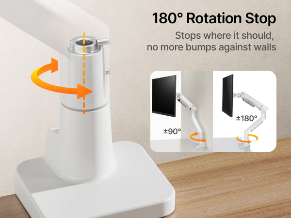 • 【Upgraded Construction】The single monitor arm is crafted from high-quality steel and aluminum, this monitor mount is engineered for durability. The gas spring design has undergone over 20,000 times life test to ensure long-lasting performance. It can effectively reduce wobbling during use and keep the screen stable. The upgraded arm design allows full 360° adjustment, giving you greater flexibility and a extensive range of using angles